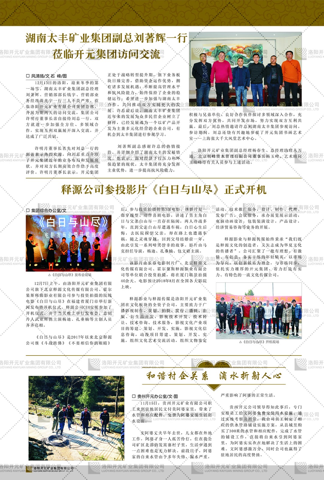 洛陽開元礦業(yè)集團有限公司簡介洛陽開元礦業(yè)集團有限公司,始成立于2006年,位于洛陽市開元大道269號。集團旗下共有五余家全資子公司,業(yè)務(wù)涉及有色金屬礦山開發(fā)、礦產(chǎn)品購銷與進(jìn)出口貿(mào)易、房地產(chǎn)開發(fā)、文化藝術(shù)、企業(yè)管理與咨詢、資本投資等多個領(lǐng)域。民建河南省委委員、民建河南省委企業(yè)委副主任、民建洛陽市委委員、企業(yè)委主任、洛陽民建企業(yè)家協(xié)會會長許明月是公司創(chuàng)始人,現(xiàn)任洛陽開元礦業(yè)集團有限公司董事長。在礦業(yè)領(lǐng)域,洛陽開元礦業(yè)集團擁有多家實力雄厚的子公司:貴州開元礦業(yè)有限公司探、采礦權(quán)面積共11.33平方公里;興??h銅鑫礦業(yè)有限公司探礦權(quán)面積8.76平方公里,礦山資源潛力巨大;2021年,開元集團與盧氏中科礦業(yè)有限公司開展戰(zhàn)略合作。盧氏中科礦業(yè)有限公司專注于有色金屬的浮選、加工和銷售,擁有強大的技術(shù)支撐平臺,是集探、采、選、冶、研為一體的中大型綜合礦業(yè)企業(yè)。目前,盧氏中科王家河1000噸選礦廠已成功投產(chǎn),雙河金礦、柳關(guān)欒盧鉛鋅礦相繼順利開工,樓房銀礦與圪老灣鉛鋅礦的深部探礦重大突破,標(biāo)志著礦山版圖取得重大進(jìn)展,為開元集團后續(xù)發(fā)展奠定了堅實基礎(chǔ)。在文化傳媒領(lǐng)域,洛陽市明月美術(shù)館通過豐富多樣的藝術(shù)展覽、學(xué)術(shù)研討和公共教育活動,努力打造一個集展覽、交流、教育、研究為一體的綜合性藝術(shù)平臺。此外,在金融投資領(lǐng)域,開元集團旗下的北京明峰資本管理有限公司專注于投資具有高增長潛力的優(yōu)秀企業(yè),特別是高科技、新能源、環(huán)保等新興產(chǎn)業(yè),為客戶提供個性化的資產(chǎn)配置服務(wù)。在做好企業(yè)經(jīng)營的同時,開元集團始終不忘企業(yè)的社會責(zé)任和家國情懷,以突出的愛心公益事跡,開展了一系列公益慈善活動:“民建林”公益事業(yè)通過“思源基金”“幫幫公益”線上公益平臺,與眾多愛心人士籌措資金20余萬元;資助541名貧困大學(xué)生共計270余萬元,推進(jìn)“數(shù)字助力——河南AI人才培養(yǎng)”;捐款10萬元,馳援京津冀、黑龍江洪水地質(zhì)災(zāi)害……公司于2017年底被洛陽市慈善總會評為“洛陽慈善風(fēng)云榜——十大愛心集體”。洛陽開元礦業(yè)集團有限公司秉承持續(xù)發(fā)展理念,憑借多年來良好的企業(yè)信譽與經(jīng)營業(yè)績,與全國多家企業(yè)建立了良好合作關(guān)系,受到社會各界的一致好評,多次榮獲“納稅標(biāo)兵”“先進(jìn)企業(yè)”“招商引資模范企業(yè)”等榮譽稱號?;赝麃頃r路,開元人勠力同心,以“闖”的精神和“創(chuàng)”的勁頭,一路披荊斬棘,踏過千山萬水;展望新未來,開元人凝心聚力,不執(zhí)于“舊”,無畏于“新”,秉承“勇于跨越,追求卓越”的企業(yè)精神,乘著國家高質(zhì)量發(fā)展新征程的東風(fēng),跨過高山,越過大海,向著集團多元化、國際化的目標(biāo),逐夢遠(yuǎn)航,跨越前行!