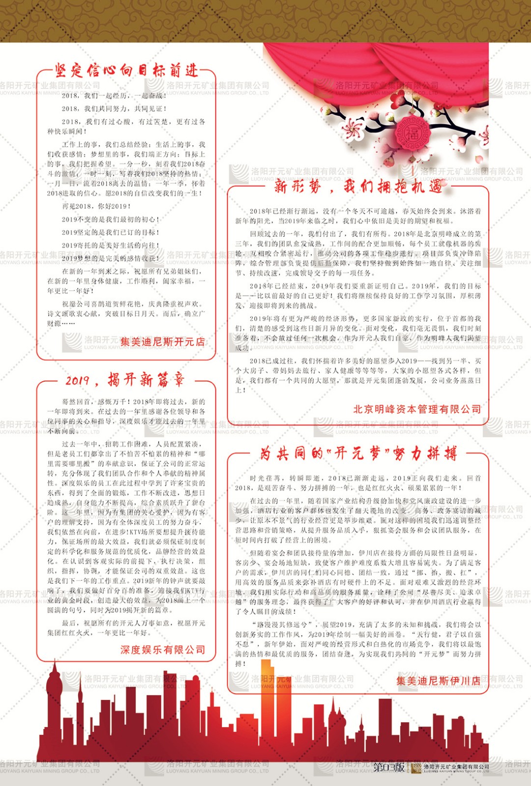 洛陽開元礦業(yè)集團(tuán)有限公司簡介洛陽開元礦業(yè)集團(tuán)有限公司,始成立于2006年,位于洛陽市開元大道269號。集團(tuán)旗下共有五余家全資子公司,業(yè)務(wù)涉及有色金屬礦山開發(fā)、礦產(chǎn)品購銷與進(jìn)出口貿(mào)易、房地產(chǎn)開發(fā)、文化藝術(shù)、企業(yè)管理與咨詢、資本投資等多個領(lǐng)域。民建河南省委委員、民建河南省委企業(yè)委副主任、民建洛陽市委委員、企業(yè)委主任、洛陽民建企業(yè)家協(xié)會會長許明月是公司創(chuàng)始人,現(xiàn)任洛陽開元礦業(yè)集團(tuán)有限公司董事長。在礦業(yè)領(lǐng)域,洛陽開元礦業(yè)集團(tuán)擁有多家實(shí)力雄厚的子公司:貴州開元礦業(yè)有限公司探、采礦權(quán)面積共11.33平方公里;興海縣銅鑫礦業(yè)有限公司探礦權(quán)面積8.76平方公里,礦山資源潛力巨大;2021年,開元集團(tuán)與盧氏中科礦業(yè)有限公司開展戰(zhàn)略合作。盧氏中科礦業(yè)有限公司專注于有色金屬的浮選、加工和銷售,擁有強(qiáng)大的技術(shù)支撐平臺,是集探、采、選、冶、研為一體的中大型綜合礦業(yè)企業(yè)。目前,盧氏中科王家河1000噸選礦廠已成功投產(chǎn),雙河金礦、柳關(guān)欒盧鉛鋅礦相繼順利開工,樓房銀礦與圪老灣鉛鋅礦的深部探礦重大突破,標(biāo)志著礦山版圖取得重大進(jìn)展,為開元集團(tuán)后續(xù)發(fā)展奠定了堅(jiān)實(shí)基礎(chǔ)。在文化傳媒領(lǐng)域,洛陽市明月美術(shù)館通過豐富多樣的藝術(shù)展覽、學(xué)術(shù)研討和公共教育活動,努力打造一個集展覽、交流、教育、研究為一體的綜合性藝術(shù)平臺。此外,在金融投資領(lǐng)域,開元集團(tuán)旗下的北京明峰資本管理有限公司專注于投資具有高增長潛力的優(yōu)秀企業(yè),特別是高科技、新能源、環(huán)保等新興產(chǎn)業(yè),為客戶提供個性化的資產(chǎn)配置服務(wù)。在做好企業(yè)經(jīng)營的同時,開元集團(tuán)始終不忘企業(yè)的社會責(zé)任和家國情懷,以突出的愛心公益事跡,開展了一系列公益慈善活動:“民建林”公益事業(yè)通過“思源基金”“幫幫公益”線上公益平臺,與眾多愛心人士籌措資金20余萬元;資助541名貧困大學(xué)生共計(jì)270余萬元,推進(jìn)“數(shù)字助力——河南AI人才培養(yǎng)”;捐款10萬元,馳援京津冀、黑龍江洪水地質(zhì)災(zāi)害……公司于2017年底被洛陽市慈善總會評為“洛陽慈善風(fēng)云榜——十大愛心集體”。洛陽開元礦業(yè)集團(tuán)有限公司秉承持續(xù)發(fā)展理念,憑借多年來良好的企業(yè)信譽(yù)與經(jīng)營業(yè)績,與全國多家企業(yè)建立了良好合作關(guān)系,受到社會各界的一致好評,多次榮獲“納稅標(biāo)兵”“先進(jìn)企業(yè)”“招商引資模范企業(yè)”等榮譽(yù)稱號。回望來時路,開元人勠力同心,以“闖”的精神和“創(chuàng)”的勁頭,一路披荊斬棘,踏過千山萬水;展望新未來,開元人凝心聚力,不執(zhí)于“舊”,無畏于“新”,秉承“勇于跨越,追求卓越”的企業(yè)精神,乘著國家高質(zhì)量發(fā)展新征程的東風(fēng),跨過高山,越過大海,向著集團(tuán)多元化、國際化的目標(biāo),逐夢遠(yuǎn)航,跨越前行!