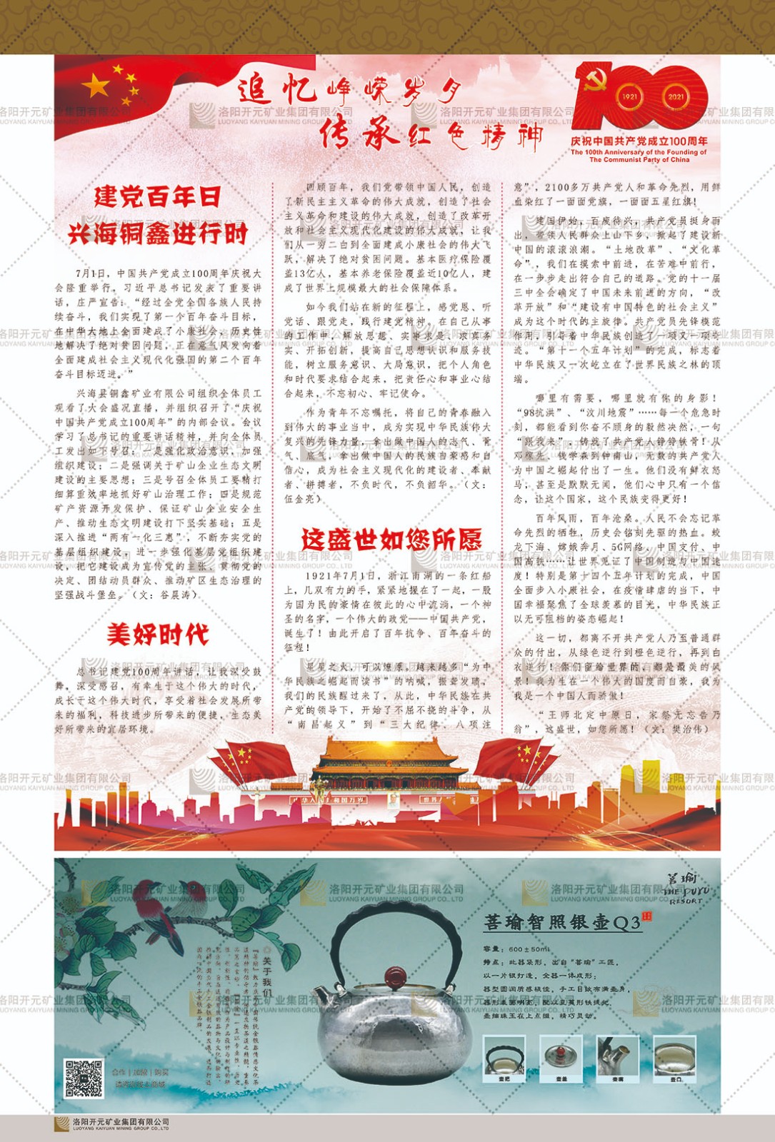 洛陽開元礦業(yè)集團有限公司簡介洛陽開元礦業(yè)集團有限公司,始成立于2006年,位于洛陽市開元大道269號。集團旗下共有五余家全資子公司,業(yè)務(wù)涉及有色金屬礦山開發(fā)、礦產(chǎn)品購銷與進出口貿(mào)易、房地產(chǎn)開發(fā)、文化藝術(shù)、企業(yè)管理與咨詢、資本投資等多個領(lǐng)域。民建河南省委委員、民建河南省委企業(yè)委副主任、民建洛陽市委委員、企業(yè)委主任、洛陽民建企業(yè)家協(xié)會會長許明月是公司創(chuàng)始人,現(xiàn)任洛陽開元礦業(yè)集團有限公司董事長。在礦業(yè)領(lǐng)域,洛陽開元礦業(yè)集團擁有多家實力雄厚的子公司:貴州開元礦業(yè)有限公司探、采礦權(quán)面積共11.33平方公里;興??h銅鑫礦業(yè)有限公司探礦權(quán)面積8.76平方公里,礦山資源潛力巨大;2021年,開元集團與盧氏中科礦業(yè)有限公司開展戰(zhàn)略合作。盧氏中科礦業(yè)有限公司專注于有色金屬的浮選、加工和銷售,擁有強大的技術(shù)支撐平臺,是集探、采、選、冶、研為一體的中大型綜合礦業(yè)企業(yè)。目前,盧氏中科王家河1000噸選礦廠已成功投產(chǎn),雙河金礦、柳關(guān)欒盧鉛鋅礦相繼順利開工,樓房銀礦與圪老灣鉛鋅礦的深部探礦重大突破,標(biāo)志著礦山版圖取得重大進展,為開元集團后續(xù)發(fā)展奠定了堅實基礎(chǔ)。在文化傳媒領(lǐng)域,洛陽市明月美術(shù)館通過豐富多樣的藝術(shù)展覽、學(xué)術(shù)研討和公共教育活動,努力打造一個集展覽、交流、教育、研究為一體的綜合性藝術(shù)平臺。此外,在金融投資領(lǐng)域,開元集團旗下的北京明峰資本管理有限公司專注于投資具有高增長潛力的優(yōu)秀企業(yè),特別是高科技、新能源、環(huán)保等新興產(chǎn)業(yè),為客戶提供個性化的資產(chǎn)配置服務(wù)。在做好企業(yè)經(jīng)營的同時,開元集團始終不忘企業(yè)的社會責(zé)任和家國情懷,以突出的愛心公益事跡,開展了一系列公益慈善活動:“民建林”公益事業(yè)通過“思源基金”“幫幫公益”線上公益平臺,與眾多愛心人士籌措資金20余萬元;資助541名貧困大學(xué)生共計270余萬元,推進“數(shù)字助力——河南AI人才培養(yǎng)”;捐款10萬元,馳援京津冀、黑龍江洪水地質(zhì)災(zāi)害……公司于2017年底被洛陽市慈善總會評為“洛陽慈善風(fēng)云榜——十大愛心集體”。洛陽開元礦業(yè)集團有限公司秉承持續(xù)發(fā)展理念,憑借多年來良好的企業(yè)信譽與經(jīng)營業(yè)績,與全國多家企業(yè)建立了良好合作關(guān)系,受到社會各界的一致好評,多次榮獲“納稅標(biāo)兵”“先進企業(yè)”“招商引資模范企業(yè)”等榮譽稱號?;赝麃頃r路,開元人勠力同心,以“闖”的精神和“創(chuàng)”的勁頭,一路披荊斬棘,踏過千山萬水;展望新未來,開元人凝心聚力,不執(zhí)于“舊”,無畏于“新”,秉承“勇于跨越,追求卓越”的企業(yè)精神,乘著國家高質(zhì)量發(fā)展新征程的東風(fēng),跨過高山,越過大海,向著集團多元化、國際化的目標(biāo),逐夢遠航,跨越前行!