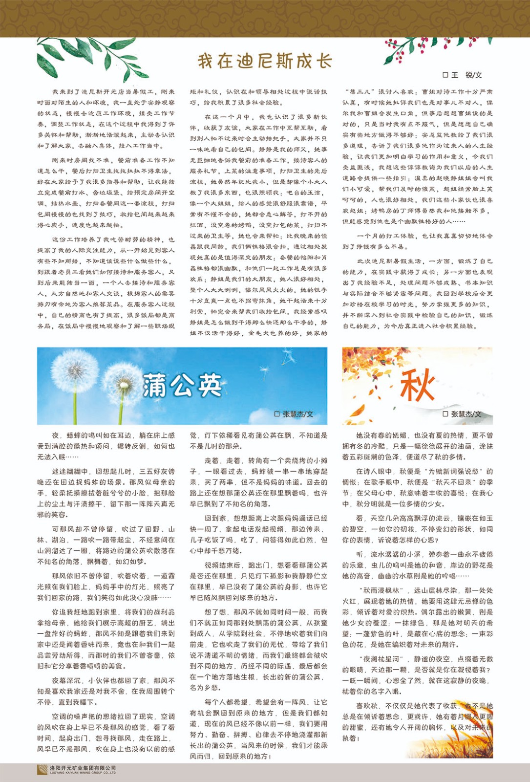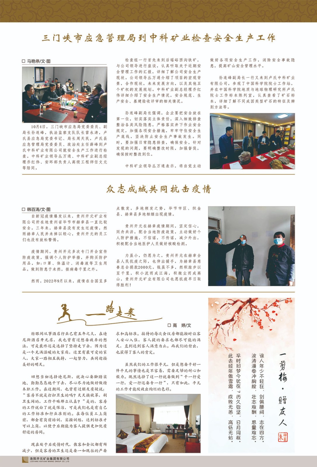洛陽開元礦業(yè)集團(tuán)有限公司簡介洛陽開元礦業(yè)集團(tuán)有限公司,始成立于2006年,位于洛陽市開元大道269號。集團(tuán)旗下共有五余家全資子公司,業(yè)務(wù)涉及有色金屬礦山開發(fā)、礦產(chǎn)品購銷與進(jìn)出口貿(mào)易、房地產(chǎn)開發(fā)、文化藝術(shù)、企業(yè)管理與咨詢、資本投資等多個領(lǐng)域。民建河南省委委員、民建河南省委企業(yè)委副主任、民建洛陽市委委員、企業(yè)委主任、洛陽民建企業(yè)家協(xié)會會長許明月是公司創(chuàng)始人,現(xiàn)任洛陽開元礦業(yè)集團(tuán)有限公司董事長。在礦業(yè)領(lǐng)域,洛陽開元礦業(yè)集團(tuán)擁有多家實力雄厚的子公司:貴州開元礦業(yè)有限公司探、采礦權(quán)面積共11.33平方公里;興??h銅鑫礦業(yè)有限公司探礦權(quán)面積8.76平方公里,礦山資源潛力巨大;2021年,開元集團(tuán)與盧氏中科礦業(yè)有限公司開展戰(zhàn)略合作。盧氏中科礦業(yè)有限公司專注于有色金屬的浮選、加工和銷售,擁有強大的技術(shù)支撐平臺,是集探、采、選、冶、研為一體的中大型綜合礦業(yè)企業(yè)。目前,盧氏中科王家河1000噸選礦廠已成功投產(chǎn),雙河金礦、柳關(guān)欒盧鉛鋅礦相繼順利開工,樓房銀礦與圪老灣鉛鋅礦的深部探礦重大突破,標(biāo)志著礦山版圖取得重大進(jìn)展,為開元集團(tuán)后續(xù)發(fā)展奠定了堅實基礎(chǔ)。在文化傳媒領(lǐng)域,洛陽市明月美術(shù)館通過豐富多樣的藝術(shù)展覽、學(xué)術(shù)研討和公共教育活動,努力打造一個集展覽、交流、教育、研究為一體的綜合性藝術(shù)平臺。此外,在金融投資領(lǐng)域,開元集團(tuán)旗下的北京明峰資本管理有限公司專注于投資具有高增長潛力的優(yōu)秀企業(yè),特別是高科技、新能源、環(huán)保等新興產(chǎn)業(yè),為客戶提供個性化的資產(chǎn)配置服務(wù)。在做好企業(yè)經(jīng)營的同時,開元集團(tuán)始終不忘企業(yè)的社會責(zé)任和家國情懷,以突出的愛心公益事跡,開展了一系列公益慈善活動:“民建林”公益事業(yè)通過“思源基金”“幫幫公益”線上公益平臺,與眾多愛心人士籌措資金20余萬元;資助541名貧困大學(xué)生共計270余萬元,推進(jìn)“數(shù)字助力——河南AI人才培養(yǎng)”;捐款10萬元,馳援京津冀、黑龍江洪水地質(zhì)災(zāi)害……公司于2017年底被洛陽市慈善總會評為“洛陽慈善風(fēng)云榜——十大愛心集體”。洛陽開元礦業(yè)集團(tuán)有限公司秉承持續(xù)發(fā)展理念,憑借多年來良好的企業(yè)信譽與經(jīng)營業(yè)績,與全國多家企業(yè)建立了良好合作關(guān)系,受到社會各界的一致好評,多次榮獲“納稅標(biāo)兵”“先進(jìn)企業(yè)”“招商引資模范企業(yè)”等榮譽稱號。回望來時路,開元人勠力同心,以“闖”的精神和“創(chuàng)”的勁頭,一路披荊斬棘,踏過千山萬水;展望新未來,開元人凝心聚力,不執(zhí)于“舊”,無畏于“新”,秉承“勇于跨越,追求卓越”的企業(yè)精神,乘著國家高質(zhì)量發(fā)展新征程的東風(fēng),跨過高山,越過大海,向著集團(tuán)多元化、國際化的目標(biāo),逐夢遠(yuǎn)航,跨越前行!