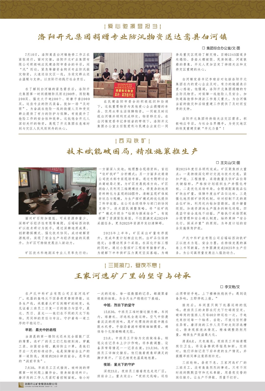 洛陽開元礦業(yè)集團有限公司簡介洛陽開元礦業(yè)集團有限公司,始成立于2006年,位于洛陽市開元大道269號。集團旗下共有五余家全資子公司,業(yè)務(wù)涉及有色金屬礦山開發(fā)、礦產(chǎn)品購銷與進出口貿(mào)易、房地產(chǎn)開發(fā)、文化藝術(shù)、企業(yè)管理與咨詢、資本投資等多個領(lǐng)域。民建河南省委委員、民建河南省委企業(yè)委副主任、民建洛陽市委委員、企業(yè)委主任、洛陽民建企業(yè)家協(xié)會會長許明月是公司創(chuàng)始人,現(xiàn)任洛陽開元礦業(yè)集團有限公司董事長。在礦業(yè)領(lǐng)域,洛陽開元礦業(yè)集團擁有多家實力雄厚的子公司:貴州開元礦業(yè)有限公司探、采礦權(quán)面積共11.33平方公里;興海縣銅鑫礦業(yè)有限公司探礦權(quán)面積8.76平方公里,礦山資源潛力巨大;2021年,開元集團與盧氏中科礦業(yè)有限公司開展戰(zhàn)略合作。盧氏中科礦業(yè)有限公司專注于有色金屬的浮選、加工和銷售,擁有強大的技術(shù)支撐平臺,是集探、采、選、冶、研為一體的中大型綜合礦業(yè)企業(yè)。目前,盧氏中科王家河1000噸選礦廠已成功投產(chǎn),雙河金礦、柳關(guān)欒盧鉛鋅礦相繼順利開工,樓房銀礦與圪老灣鉛鋅礦的深部探礦重大突破,標志著礦山版圖取得重大進展,為開元集團后續(xù)發(fā)展奠定了堅實基礎(chǔ)。在文化傳媒領(lǐng)域,洛陽市明月美術(shù)館通過豐富多樣的藝術(shù)展覽、學(xué)術(shù)研討和公共教育活動,努力打造一個集展覽、交流、教育、研究為一體的綜合性藝術(shù)平臺。此外,在金融投資領(lǐng)域,開元集團旗下的北京明峰資本管理有限公司專注于投資具有高增長潛力的優(yōu)秀企業(yè),特別是高科技、新能源、環(huán)保等新興產(chǎn)業(yè),為客戶提供個性化的資產(chǎn)配置服務(wù)。在做好企業(yè)經(jīng)營的同時,開元集團始終不忘企業(yè)的社會責(zé)任和家國情懷,以突出的愛心公益事跡,開展了一系列公益慈善活動:“民建林”公益事業(yè)通過“思源基金”“幫幫公益”線上公益平臺,與眾多愛心人士籌措資金20余萬元;資助541名貧困大學(xué)生共計270余萬元,推進“數(shù)字助力——河南AI人才培養(yǎng)”;捐款10萬元,馳援京津冀、黑龍江洪水地質(zhì)災(zāi)害……公司于2017年底被洛陽市慈善總會評為“洛陽慈善風(fēng)云榜——十大愛心集體”。洛陽開元礦業(yè)集團有限公司秉承持續(xù)發(fā)展理念,憑借多年來良好的企業(yè)信譽與經(jīng)營業(yè)績,與全國多家企業(yè)建立了良好合作關(guān)系,受到社會各界的一致好評,多次榮獲“納稅標兵”“先進企業(yè)”“招商引資模范企業(yè)”等榮譽稱號?;赝麃頃r路,開元人勠力同心,以“闖”的精神和“創(chuàng)”的勁頭,一路披荊斬棘,踏過千山萬水;展望新未來,開元人凝心聚力,不執(zhí)于“舊”,無畏于“新”,秉承“勇于跨越,追求卓越”的企業(yè)精神,乘著國家高質(zhì)量發(fā)展新征程的東風(fēng),跨過高山,越過大海,向著集團多元化、國際化的目標,逐夢遠航,跨越前行!