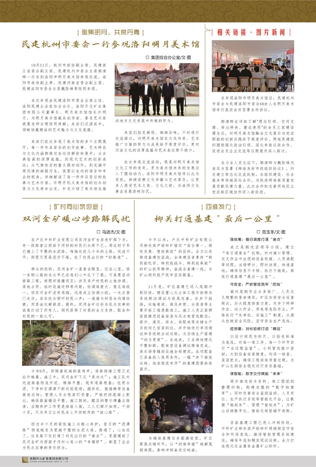洛陽(yáng)開(kāi)元礦業(yè)集團(tuán)有限公司簡(jiǎn)介洛陽(yáng)開(kāi)元礦業(yè)集團(tuán)有限公司,始成立于2006年,位于洛陽(yáng)市開(kāi)元大道269號(hào)。集團(tuán)旗下共有五余家全資子公司,業(yè)務(wù)涉及有色金屬礦山開(kāi)發(fā)、礦產(chǎn)品購(gòu)銷(xiāo)與進(jìn)出口貿(mào)易、房地產(chǎn)開(kāi)發(fā)、文化藝術(shù)、企業(yè)管理與咨詢、資本投資等多個(gè)領(lǐng)域。民建河南省委委員、民建河南省委企業(yè)委副主任、民建洛陽(yáng)市委委員、企業(yè)委主任、洛陽(yáng)民建企業(yè)家協(xié)會(huì)會(huì)長(zhǎng)許明月是公司創(chuàng)始人,現(xiàn)任洛陽(yáng)開(kāi)元礦業(yè)集團(tuán)有限公司董事長(zhǎng)。在礦業(yè)領(lǐng)域,洛陽(yáng)開(kāi)元礦業(yè)集團(tuán)擁有多家實(shí)力雄厚的子公司:貴州開(kāi)元礦業(yè)有限公司探、采礦權(quán)面積共11.33平方公里;興??h銅鑫礦業(yè)有限公司探礦權(quán)面積8.76平方公里,礦山資源潛力巨大;2021年,開(kāi)元集團(tuán)與盧氏中科礦業(yè)有限公司開(kāi)展戰(zhàn)略合作。盧氏中科礦業(yè)有限公司專(zhuān)注于有色金屬的浮選、加工和銷(xiāo)售,擁有強(qiáng)大的技術(shù)支撐平臺(tái),是集探、采、選、冶、研為一體的中大型綜合礦業(yè)企業(yè)。目前,盧氏中科王家河1000噸選礦廠已成功投產(chǎn),雙河金礦、柳關(guān)欒盧鉛鋅礦相繼順利開(kāi)工,樓房銀礦與圪老灣鉛鋅礦的深部探礦重大突破,標(biāo)志著礦山版圖取得重大進(jìn)展,為開(kāi)元集團(tuán)后續(xù)發(fā)展奠定了堅(jiān)實(shí)基礎(chǔ)。在文化傳媒領(lǐng)域,洛陽(yáng)市明月美術(shù)館通過(guò)豐富多樣的藝術(shù)展覽、學(xué)術(shù)研討和公共教育活動(dòng),努力打造一個(gè)集展覽、交流、教育、研究為一體的綜合性藝術(shù)平臺(tái)。此外,在金融投資領(lǐng)域,開(kāi)元集團(tuán)旗下的北京明峰資本管理有限公司專(zhuān)注于投資具有高增長(zhǎng)潛力的優(yōu)秀企業(yè),特別是高科技、新能源、環(huán)保等新興產(chǎn)業(yè),為客戶提供個(gè)性化的資產(chǎn)配置服務(wù)。在做好企業(yè)經(jīng)營(yíng)的同時(shí),開(kāi)元集團(tuán)始終不忘企業(yè)的社會(huì)責(zé)任和家國(guó)情懷,以突出的愛(ài)心公益事跡,開(kāi)展了一系列公益慈善活動(dòng):“民建林”公益事業(yè)通過(guò)“思源基金”“幫幫公益”線上公益平臺(tái),與眾多愛(ài)心人士籌措資金20余萬(wàn)元;資助541名貧困大學(xué)生共計(jì)270余萬(wàn)元,推進(jìn)“數(shù)字助力——河南AI人才培養(yǎng)”;捐款10萬(wàn)元,馳援京津冀、黑龍江洪水地質(zhì)災(zāi)害……公司于2017年底被洛陽(yáng)市慈善總會(huì)評(píng)為“洛陽(yáng)慈善風(fēng)云榜——十大愛(ài)心集體”。洛陽(yáng)開(kāi)元礦業(yè)集團(tuán)有限公司秉承持續(xù)發(fā)展理念,憑借多年來(lái)良好的企業(yè)信譽(yù)與經(jīng)營(yíng)業(yè)績(jī),與全國(guó)多家企業(yè)建立了良好合作關(guān)系,受到社會(huì)各界的一致好評(píng),多次榮獲“納稅標(biāo)兵”“先進(jìn)企業(yè)”“招商引資模范企業(yè)”等榮譽(yù)稱(chēng)號(hào)。回望來(lái)時(shí)路,開(kāi)元人勠力同心,以“闖”的精神和“創(chuàng)”的勁頭,一路披荊斬棘,踏過(guò)千山萬(wàn)水;展望新未來(lái),開(kāi)元人凝心聚力,不執(zhí)于“舊”,無(wú)畏于“新”,秉承“勇于跨越,追求卓越”的企業(yè)精神,乘著國(guó)家高質(zhì)量發(fā)展新征程的東風(fēng),跨過(guò)高山,越過(guò)大海,向著集團(tuán)多元化、國(guó)際化的目標(biāo),逐夢(mèng)遠(yuǎn)航,跨越前行!